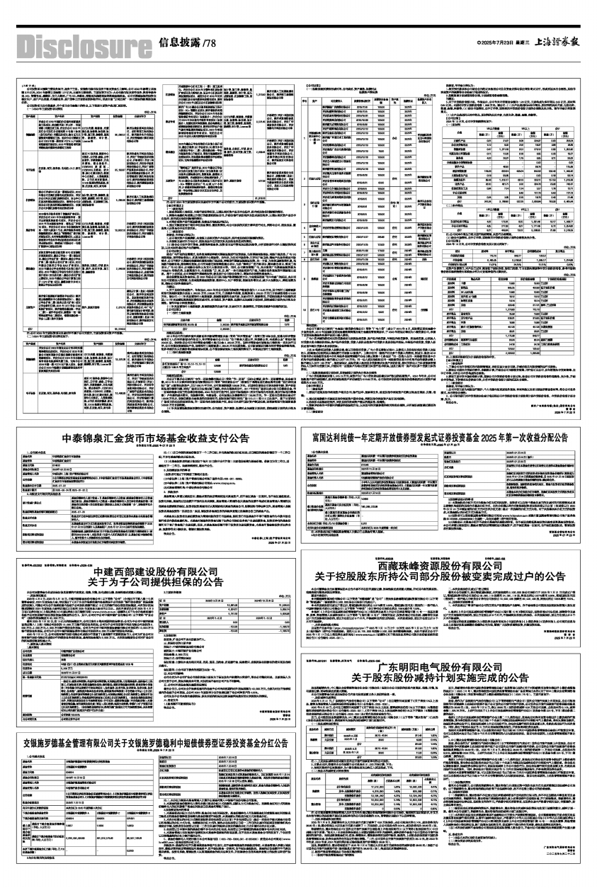 截至2025年7月20日,在15亿元的担保额度内,公司共发生6笔未到期的担保事项:公司为子公司中建西部建设集团第八(上海)有限公司提供的10,000万元银行授信业务担保,公司为子公司砼联数字科技有限公司提供的2,000万元、2,000万元、5,000万元银行授信业务担保,公司为子公司中建西部建设新疆有限公司提供的10,000万元银行授信业务担保,公司为子公司中建西部建设贵州有限公司提供的8,000万元银行授信业务担保。