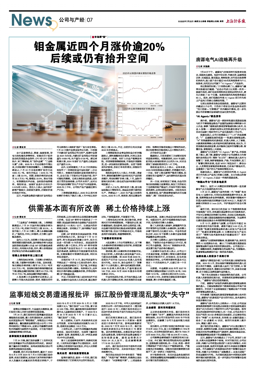 “工业黄金”价格继续上涨。上海钢联数据显示,7月24日国内氧化镨钕价格为52万元/吨,相较于年初已上涨30.5%。A股市场上,7月24日稀土、稀土永磁板块飘红,广晟有色、中科三环涨停,北方稀土盘中触及涨停。
