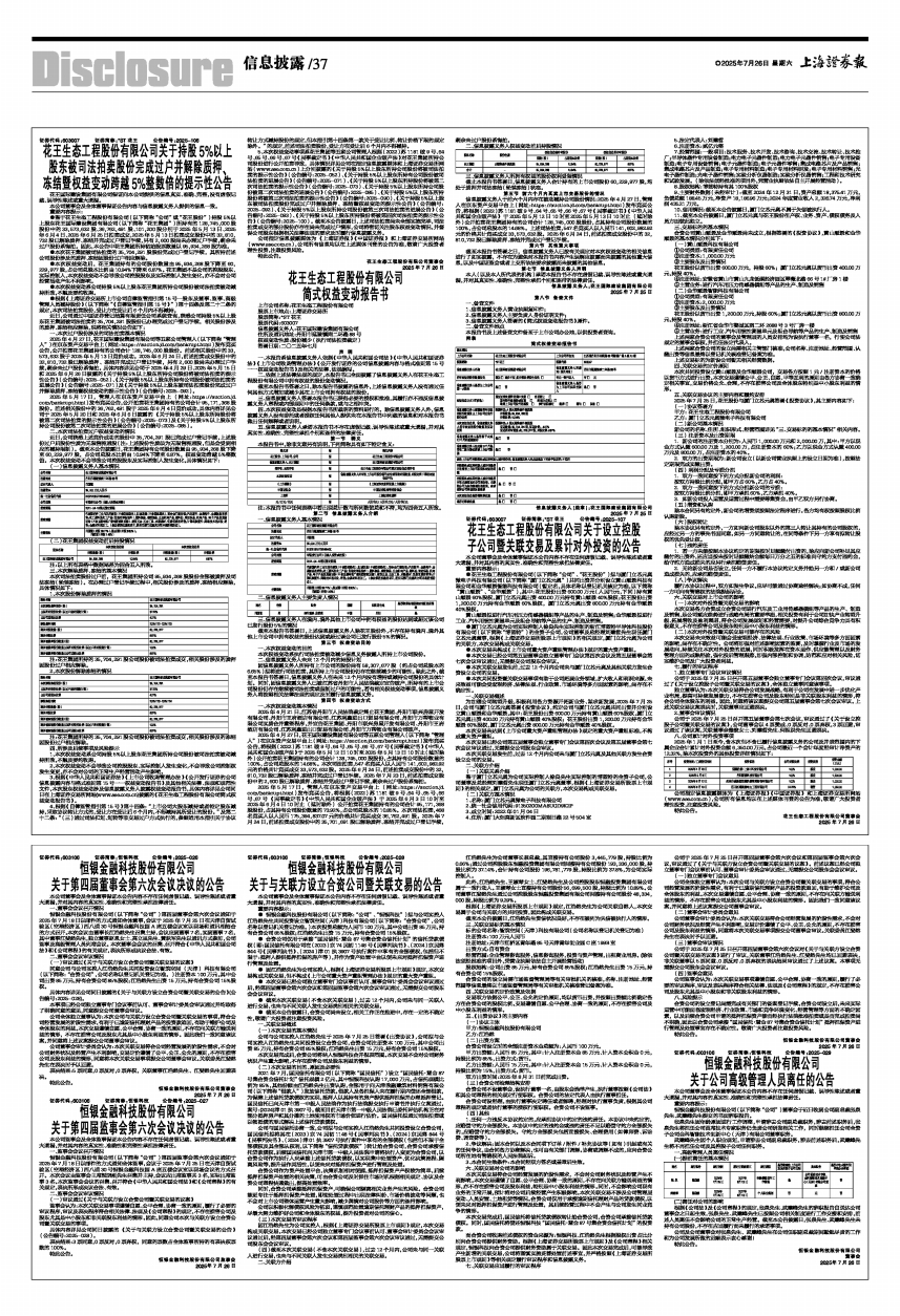 ●鉴于花王生态工程股份有限公司(以下简称“公司”或“花王股份”)持股5%以上股东花王国际建设集团有限公司(以下简称“花王集团”)所持有的128,745,000股股份中的33,573,632股、36,762,491股、101,200股分别于2025年5月13日、2025年6月4日、2025年6月25日拍卖成交,2025年5月13日拍卖成交股份中的32,810,732股已解除质押、冻结并完成过户登记手续,另有2,600股尚未办理过户手续,剩余未过户股份系悔拍。因此,本公告中花王集团所持初始股票数量以95,934,268股为准。