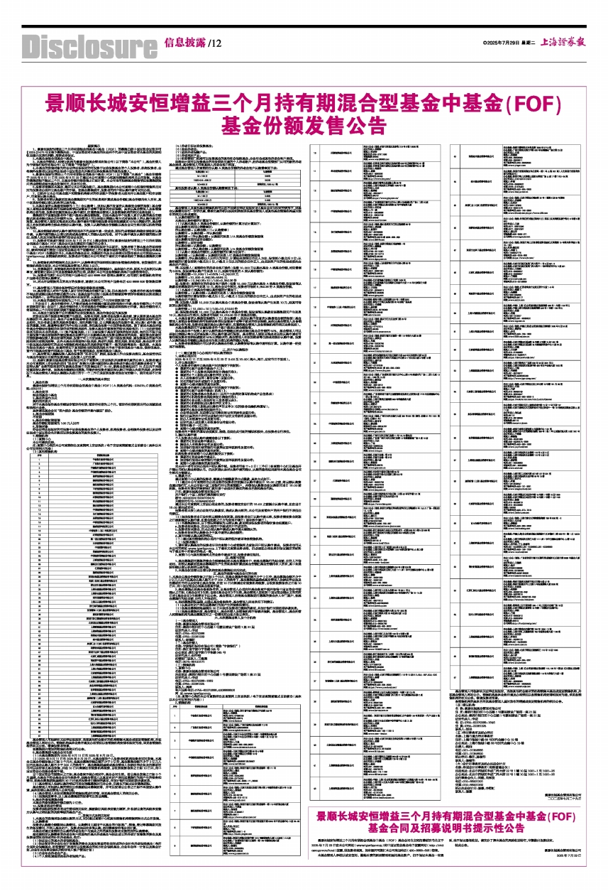 11、投资者可阅读刊登在2025年7月29日《上海证券报》的《景顺长城安恒增益三个月持有期混合型基金中基金(FOF)基金合同及招募说明书提示性公告》。
