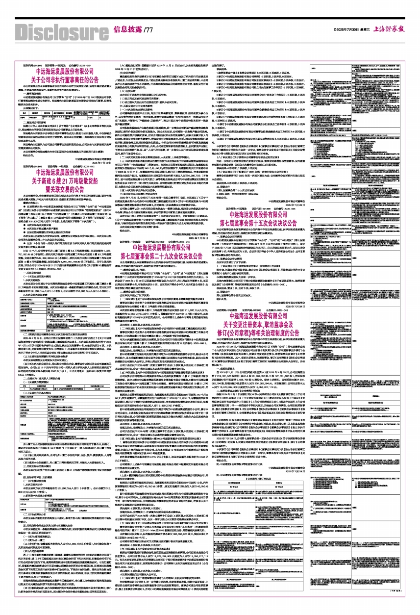 2025年7月29日,中远海运发展股份有限公司(以下简称“公司”)第七届董事会第二十九次会议审议通过《关于变更公司注册资本的议案》及《关于取消监事会并修订〈公司章程〉及相关治理制度的议案》,同意公司变更注册资本、取消监事会及修订《公司章程》及相关治理制度。其中,变更注册资本、取消监事会、修订《公司章程》《股东会议事规则》《董事会议事规则》及《独立非执行董事工作细则》尚需提交公司股东大会审议。具体情况如下: