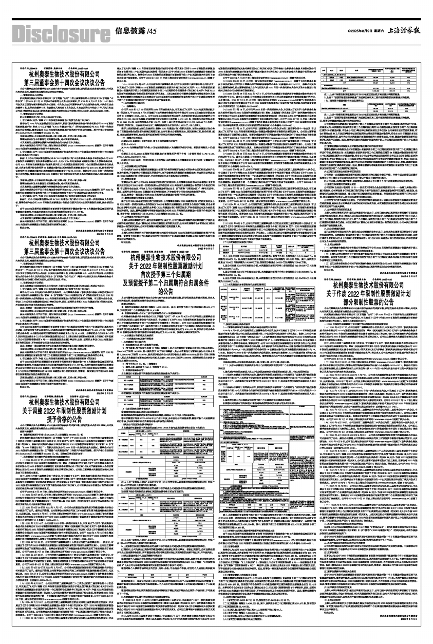 2025年8月8日,公司召开的第三届董事会第十四次会议审议通过了《关于〈2022年限制性股票激励计划首次授予第三个归属期及预留授予第二个归属期符合归属条件〉的议案》。根据《上市公司股权激励管理办法》(以下简称“《管理办法》”)、《杭州奥泰生物技术股份有限公司2022年限制性股票激励计划(草案)》(以下简称“《2022年激励计划》”)、《考核管理办法》、公司《2024年年度报告》及激励对象个人绩效考核结果,董事会认为:公司2022年限制性股票激励计划首次授予第三个归属期及预留授予第二个归属期归属条件已经成就,本次首次授予符合条件的94名激励对象可归属的限制性股票数量合计为409,472股,预留授予符合条件的18名激励对象可归属的限制性股票数量合计为29,418股。根据公司2022年第一次临时股东大会的授权,董事会同意按照《2022年激励计划》的相关规定为符合条件的激励对象办理归属相关事宜。董事陆维克先生作为本次激励计划的激励对象对该议案回避表决。