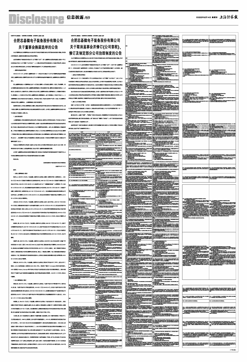 2025年8月13日,合肥芯碁微电子装备股份有限公司(以下简称“公司”)召开了第二届董事会第二十一次会议及第二届监事会第十八次会议,审议通过了《关于取消监事会并修订〈公司章程〉、修订及制定相关制度的议案》,该议案尚需提交公司股东大会审议,现将具体情况公告如下: