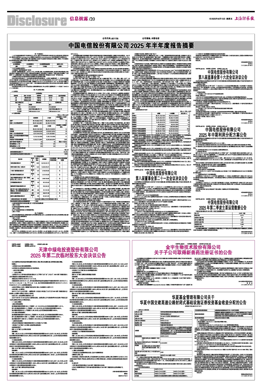 具体内容详见公司同日披露于上海证券交易所网站(www.sse.com.cn)及指定媒体的《中国电信股份有限公司2025年半年度报告》及其摘要。