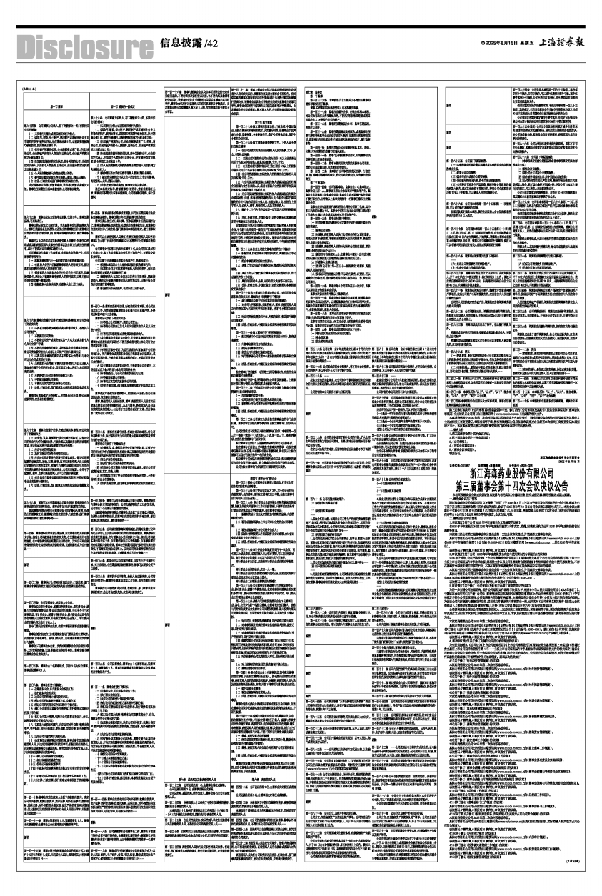 浙江海森药业股份有限公司(以下简称“公司”)于2025年8月2日以电子邮件及电话通知的方式向全体董事发出了关于召开第三届董事会第十四次会议的通知,会议于2025年8月13日在公司会议室以现场方式召开。本次会议由董事长王式跃先生主持,应出席董事7名,实际出席董事7名。公司监事、高级管理人员列席了本次会议。本次会议的召集和召开符合《公司法》《公司章程》等有关规定,会议合法、有效。