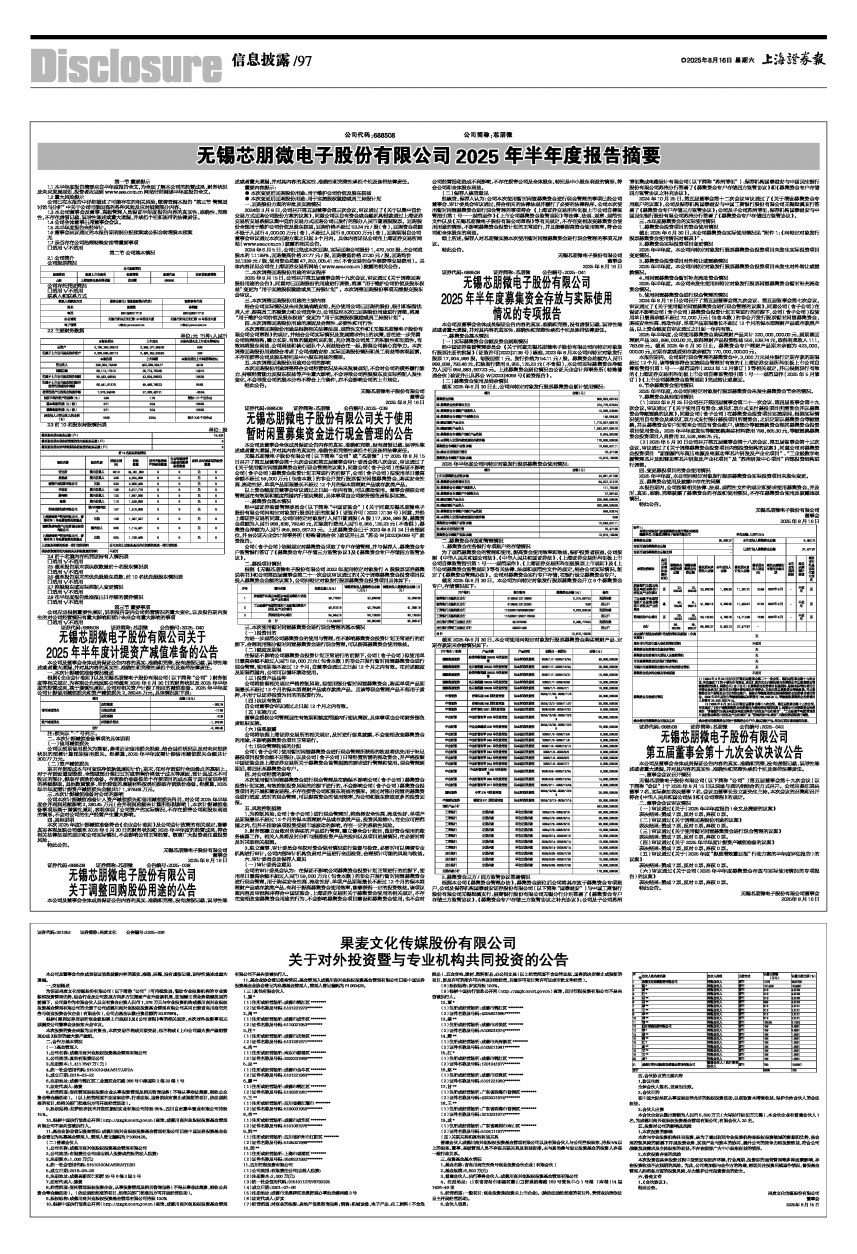 无锡芯朋微电子股份有限公司(以下简称“公司”)第五届董事会第十九次会议(以下简称“会议”)于2025年8月15日以现场与通讯相结合的方式召开。公司应参加表决董事7名,实际参加表决董事7名,会议由董事长张立新先生主持。本次会议的召集和召开符合《中华人民共和国公司法》和《公司章程》的规定。