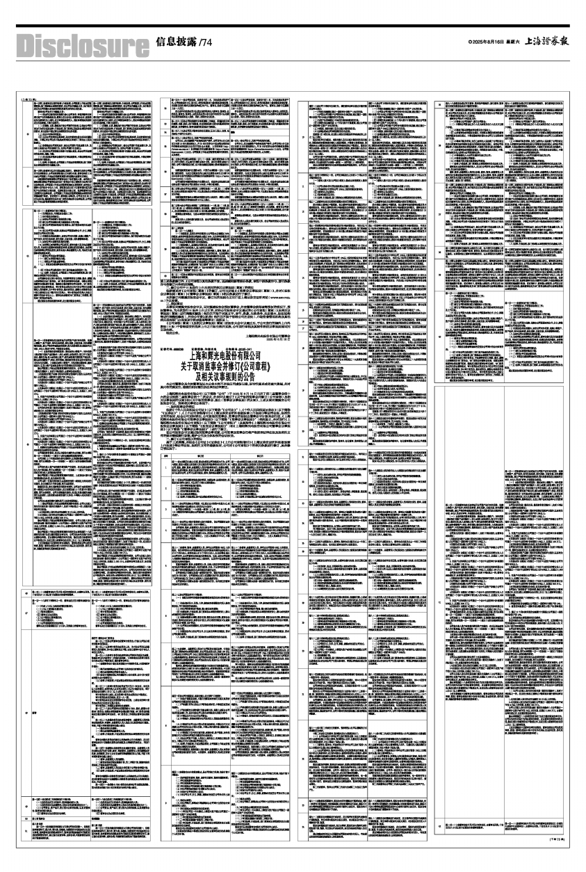 上海和辉光电股份有限公司(以下简称“公司”)于2025年8月14日召开了第二届董事会第十六次会议和第二届监事会第十二次会议,分别审议通过了《关于取消监事会并修订〈公司章程〉及相关议事规则的议案》和《关于取消监事会、废止〈监事会议事规则〉的议案》,上述议案尚需提交公司股东会审议。现将相关事项公告如下:
