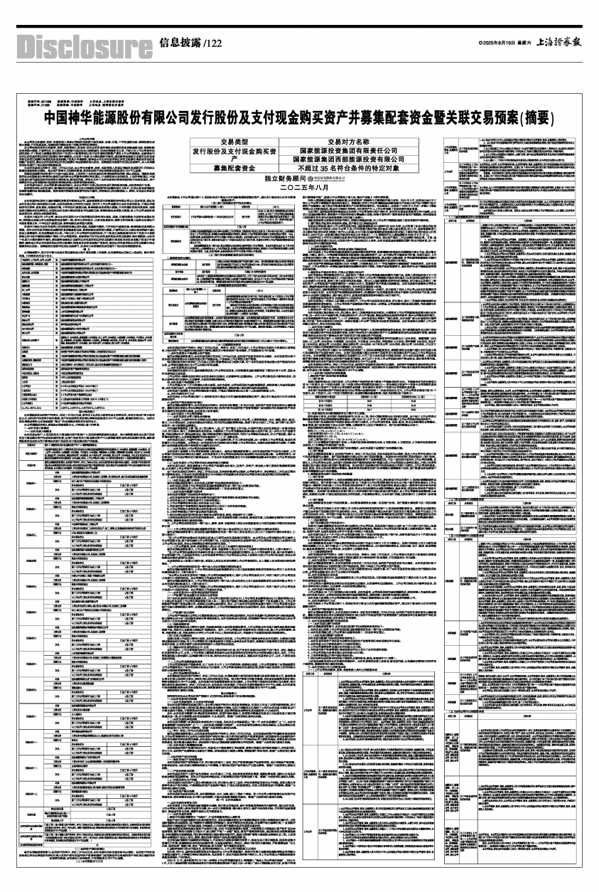 中国神华拟通过发行A股股份及支付现金的方式购买国家能源集团持有的国源电力100%股权、新疆能源100%股权、化工公司100%股权、乌海能源100%股权、平庄煤业100%股权、神延煤炭41%股权、晋神能源49%股权、包头矿业100%股权、航运公司100%股权、煤炭运销公司100%股权、电子商务公司100%股权、港口公司100%股权,并以支付现金的方式购买西部能源持有的内蒙建投100%股权。