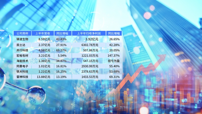 截至8月17日,北交所首批25家上市公司2025年半年报已经披露,其中18家公司上半年归母净利润实现同比增长。具体来看,锦波生物上半年实现归母净利润3.92亿元,成为已披露业绩的公司中盈利能力最强的企业;民士达、建邦科技、邦德股份、星昊医药上半年归母净利润均超过4000万元;宏裕包材业绩同比倍增;卓兆点胶、颖泰生物、海能技术等实现同比扭亏为盈。