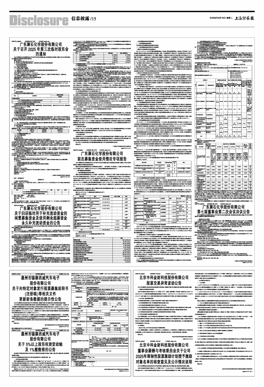 截至2025年8月18日,广东聚石化学股份有限公司(以下简称“公司”)已将前次暂时用于补充流动资金的9,000.00万元闲置募集资金归还至募集资金专用账户,并将归还募集资金的情况通知了保荐机构及保荐代表人。