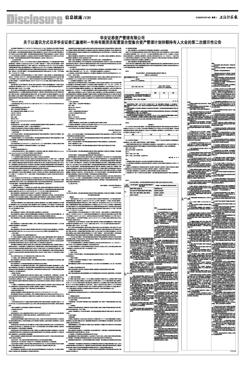 华安证券资产管理有限公司已于2025年8月15日和2025年8月18日在《上海证券报》及华安证券资产管理有限公司官网(https://www.hazq.com/zg/home/index.shtml)公布《华安证券资产管理有限公司关于以通讯方式召开华安证券汇赢增利一年持有期灵活配置混合型集合资产管理计划份额持有人大会的公告》和《华安证券资产管理有限公司关于以通讯方式召开华安证券汇赢增利一年持有期灵活配置混合型集合资产管理计划份额持有人大会的第一次提示性公告》,为了使本次集合计划份额持有人大会顺利召开,现发布《华安证券资产管理有限公司关于以通讯方式召开华安证券汇赢增利一年持有期灵活配置混合型集合资产管理计划份额持有人大会的第二次提示性公告》。