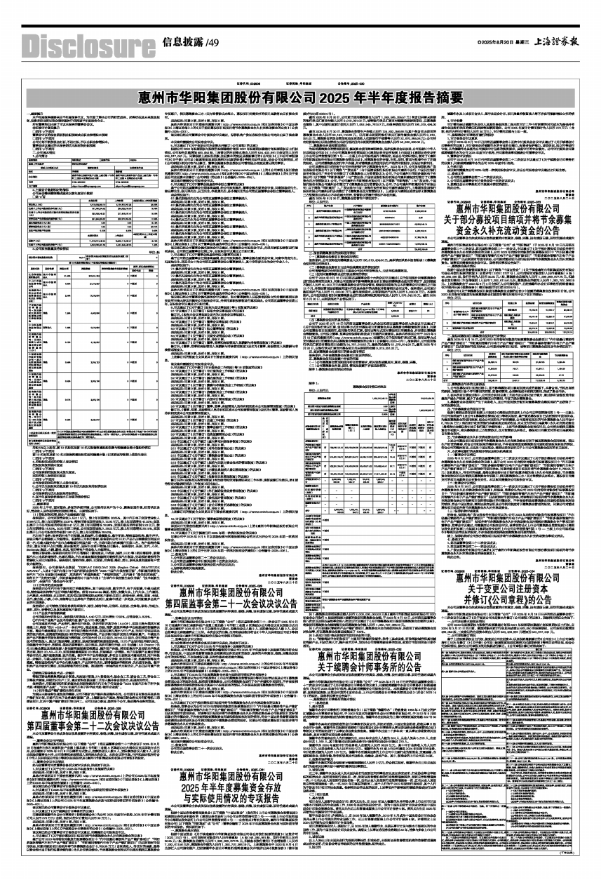 根据中国证券监督管理委员会(以下简称“中国证监会”)发布的《上市公司募集资金监管规则》和深圳证券交易所颁布的《深圳证券交易所上市公司自律监管指引第1号一一主板上市公司规范运作》《深圳证券交易所上市公司自律监管指南第2号一一公告格式》等有关规定,惠州市华阳集团股份有限公司(以下简称“华阳集团”或“公司”)董事会编制了2025年半年度募集资金存放与实际使用情况的专项报告。情况说明如下: