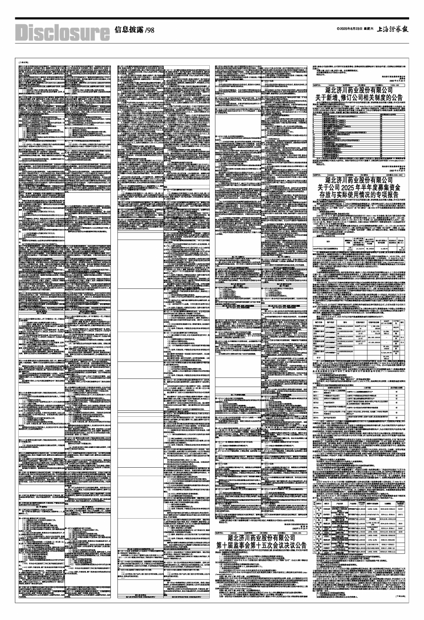 根据中国证券监督管理委员会《上市公司募集资金监管规则》《上海证券交易所上市公司自律监管指引第1号一一规范运作》以及《上海证券交易所上市公司自律监管指南第1号一一公告格式》的相关规定,湖北济川药业股份有限公司(以下简称“公司”、“本公司”或“济川药业”)就2025年半年度募集资金存放与使用情况作如下专项报告: