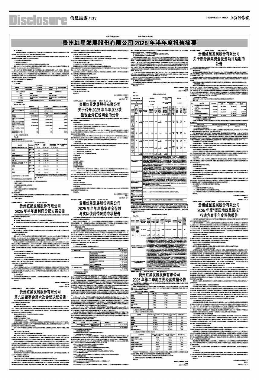 为深入学习贯彻党的二十大和中央金融工作会议精神,强化落实国务院《关于进一步提高上市公司质量的意见》(国发(2020)14号)等要求,积极响应《关于开展沪市公司“提质增效重回报”专项行动的倡议》,深度践行“投资者为本”的理念,贵州红星发展股份有限公司(下称公司)于 2025年4月26日在上海证券交易所官方网站发布了《关于2025年度“提质增效重回报”行动方案的公告》。半年来,根据行动方案,公司积极开展和落实相关工作。2025年8月21日,公司召开第九届董事会第六次会议审议通过了《2025年度“提质增效重回报”行动方案半年度评估报告》的议案,现将行动方案半年度评估情况报告如下: