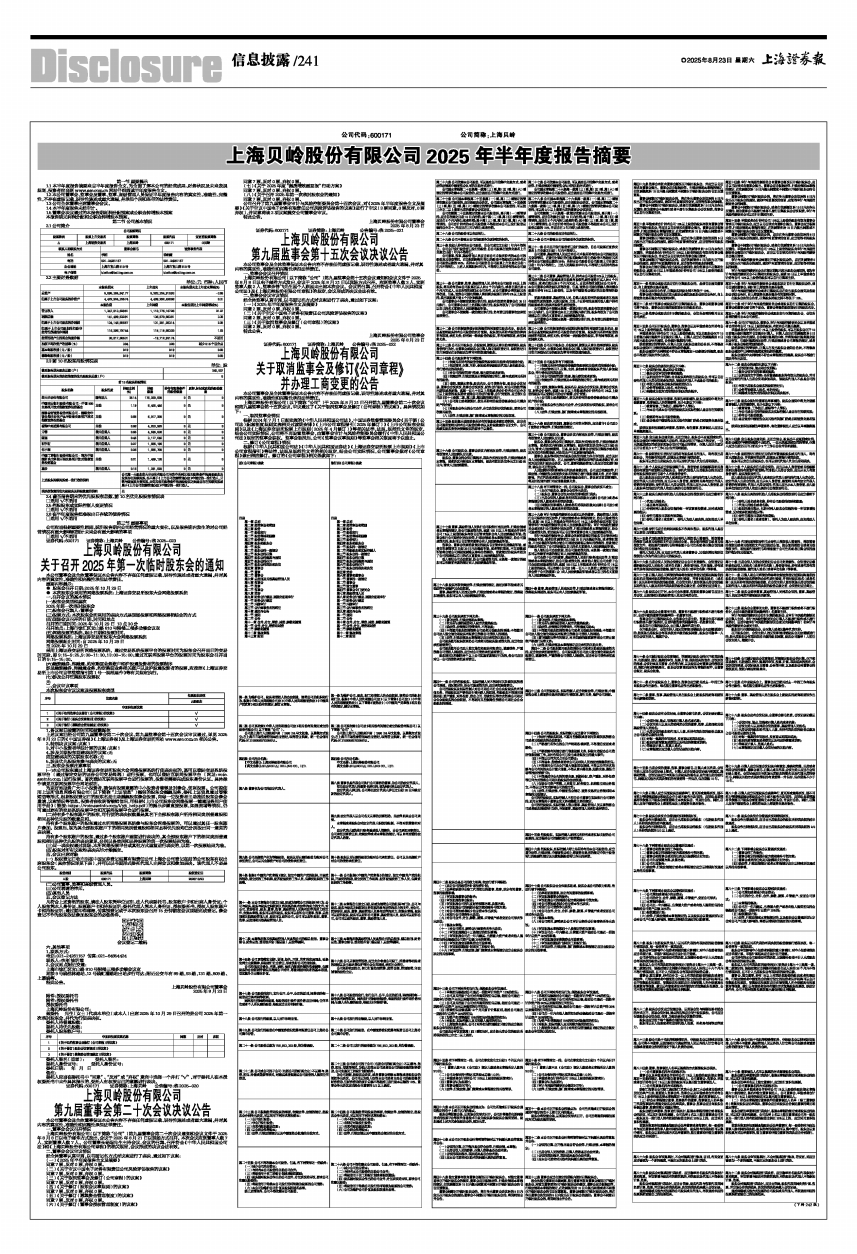 上海贝岭股份有限公司(以下简称“公司”)第九届董事会第二十次会议通知和会议文件于2025年8月8日以电子邮件方式发出,会议于2025年8月21日以现场方式召开。本次会议应到董事人数7人,实到董事人数7人。公司董事长杨琨先生主持会议,会议的召集、召开符合《中华人民共和国公司法》和《上海贝岭股份有限公司章程》的相关规定,会议形成的决议合法有效。