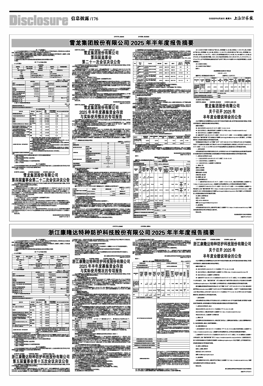 具体内容详见2025年8月30日于上海证券交易所网站(www.sse.com.cn)及指定媒体披露的《雪龙集团股份有限公司2025年半年度报告》及《雪龙集团股份有限公司2025年半年度报告摘要》。