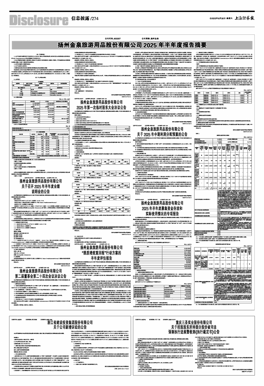 根据中国证监会《上市公司募集资金监管规则》、上海证券交易所《上海证券交易所上市公司自律监管指引第1号一一规范运作》等有关要求,现将扬州金泉旅游用品股份有限公司(以下简称“扬州金泉”或“公司”)2025年半年度募集资金存放与使用情况报告如下: