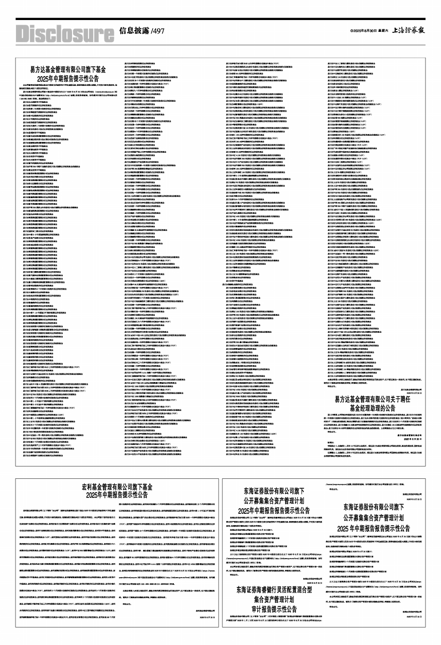 宏利基金管理有限公司(以下简称“本公司”)董事会及董事保证旗下基金2025年中期报告所载资料不存在虚假记载、误导性陈述或重大遗漏,并对其内容的真实性、准确性和完整性承担个别及连带责任。本公司旗下宏利价值优化型成长类行业混合型证券投资基金、宏利价值优化型周期类行业混合型证券投资基金、宏利价值优化型稳定类行业混合型证券投资基金、宏利行业精选混合型证券投资基金、宏利风险预算混合型证券投资基金、宏利货币市场基金、宏利效率优选混合型证券投资基金(LOF)、宏利首选企业股票型证券投资基金、宏利市值优选混合型证券投资基金、宏利集利债券型证券投资基金、宏利红利先锋混合型证券投资基金、宏利沪深300指数增强型证券投资基金、宏利领先中小盘混合型证券投资基金、宏利聚利债券型证券投资基金(LOF)、宏利中证500指数增强型证券投资基金(LOF)、宏利逆向策略混合型证券投资基金、宏利宏达混合型证券投资基金、宏利淘利债券型证券投资基金、宏利转型机遇股票型证券投资基金、宏利改革动力量化策略灵活配置混合型证券投资基金、宏利复兴伟业灵活配置混合型证券投资基金、宏利新起点灵活配置混合型证券投资基金、宏利蓝筹价值混合型证券投资基金、宏利创益灵活配置混合型证券投资基金、宏利活期友货币市场基金、宏利汇利债券型证券投资基金、宏利睿智稳健灵活配置混合型证券投资基金、宏利京元宝货币市场基金、宏利纯利债券型证券投资基金、宏利溢利债券型证券投资基金、宏利恒利债券型证券投资基金、宏利全能优选混合型基金中基金(FOF)、宏利交利3个月定期开放债券型发起式证券投资基金、宏利金利3个月定期开放债券型发起式证券投资基金、宏利绩优增长灵活配置混合型证券投资基金、宏利泽利3个月定期开放债券型发起式证券投资基金、宏利泰和平衡养老目标三年持有期混合型基金中基金(FOF)、宏利印度机会股票型证券投资基金(QDII)、宏利永利债券型证券投资基金、宏利消费行业量化精选混合型证券投资基金、宏利中证主要消费红利指数型证券投资基金、宏利泰和稳健养老目标一年持有期混合型基金中基金(FOF)、宏利价值长青混合型证券投资基金、宏利乐盈66个月定期开放债券型证券投资基金、宏利高研发创新6个月持有期混合型证券投资基金、宏利波控回报12个月持有期混合型证券投资基金、宏利消费服务混合型证券投资基金、宏利新能源股票型证券投资基金、宏利中债1-5年国开行债券指数证券投资基金、宏利新兴景气龙头混合型证券投资基金、宏利悠然养老目标日期2025一年持有期混合型基金中基金(FOF)、宏利景气领航两年持有期混合型证券投资基金、宏利中短债债券型证券投资基金、宏利先进制造股票型证券投资基金、宏利景气智选18个月持有期混合型证券投资基金、宏利闽利一年定期开放债券型发起式证券投资基金、宏利昇利一年定期开放债券型发起式证券投资基金、宏利悠享养老目标日期2030一年持有期混合型基金中基金(FOF)、宏利添盈两年定期开放债券型证券投资基金、宏利医药健康混合型发起式证券投资基金、宏利睿智成长混合型证券投资基金、宏利中债-绿色普惠主题金融债券优选指数证券投资基金、宏利半导体产业混合型发起式证券投资基金、宏利鑫享90天持有期债券型证券投资基金、宏利价值驱动六个月持有期混合型证券投资基金、宏利高端装备股票型证券投资基金、宏利中证同业存单AAA指数7天持有期证券投资基金、宏利中证A500指数增强型证券投资基金、宏利悦利利率债债券型证券投资基金的2025年中期报告全文于2025年8月30日在本公司网站(https://www.manulifefund.com.cn)和中国证监会基金电子披露网站(http://eid.csrc.gov.cn/fund)披露,供投资者查阅。如有疑问可拨打本公司客服电话(400-698-8888或010-66555662)咨询。