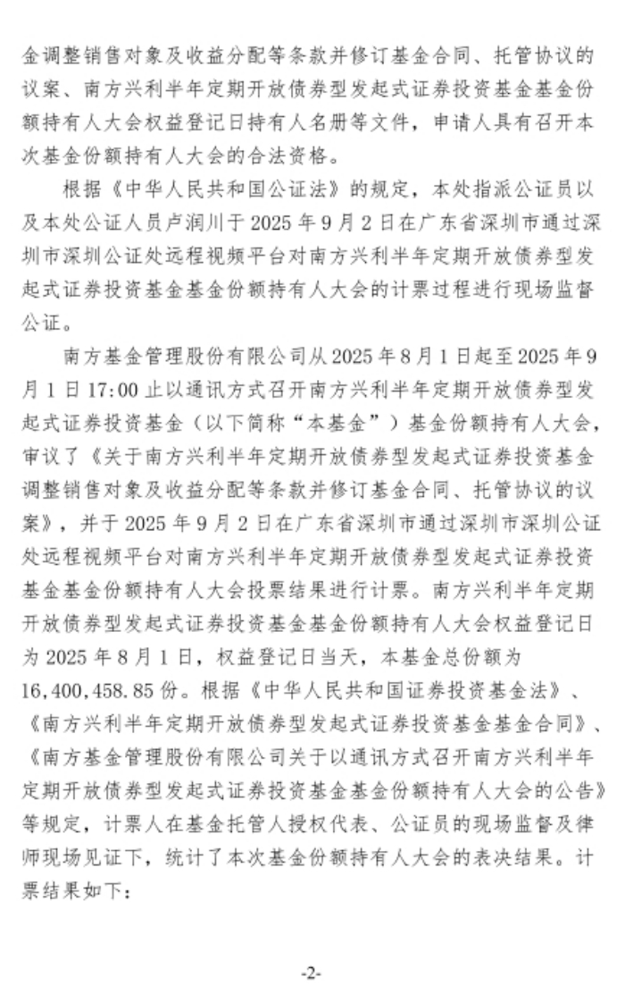 会议审议了《关于南方兴利半年定期开放债券型发起式证券投资基金调整销售对象及收益分配等条款并修订基金合同、托管协议的议案》(以下简称“本次会议议案”),并由参加大会且有权表决的基金份额持有人或其代理人对本次会议议案进行表决。表决结果为:16,399,104.43份基金份额同意,0份基金份额反对,0份基金份额弃权。同意本次会议议案的基金份额占提交有效表决票的基金份额持有人或其代理人所持表决权的二分之一以上,符合《中华人民共和国证券投资基金法》《公开募集证券投资基金运作管理办法》和基金合同的有关规定,本次会议议案获得通过。