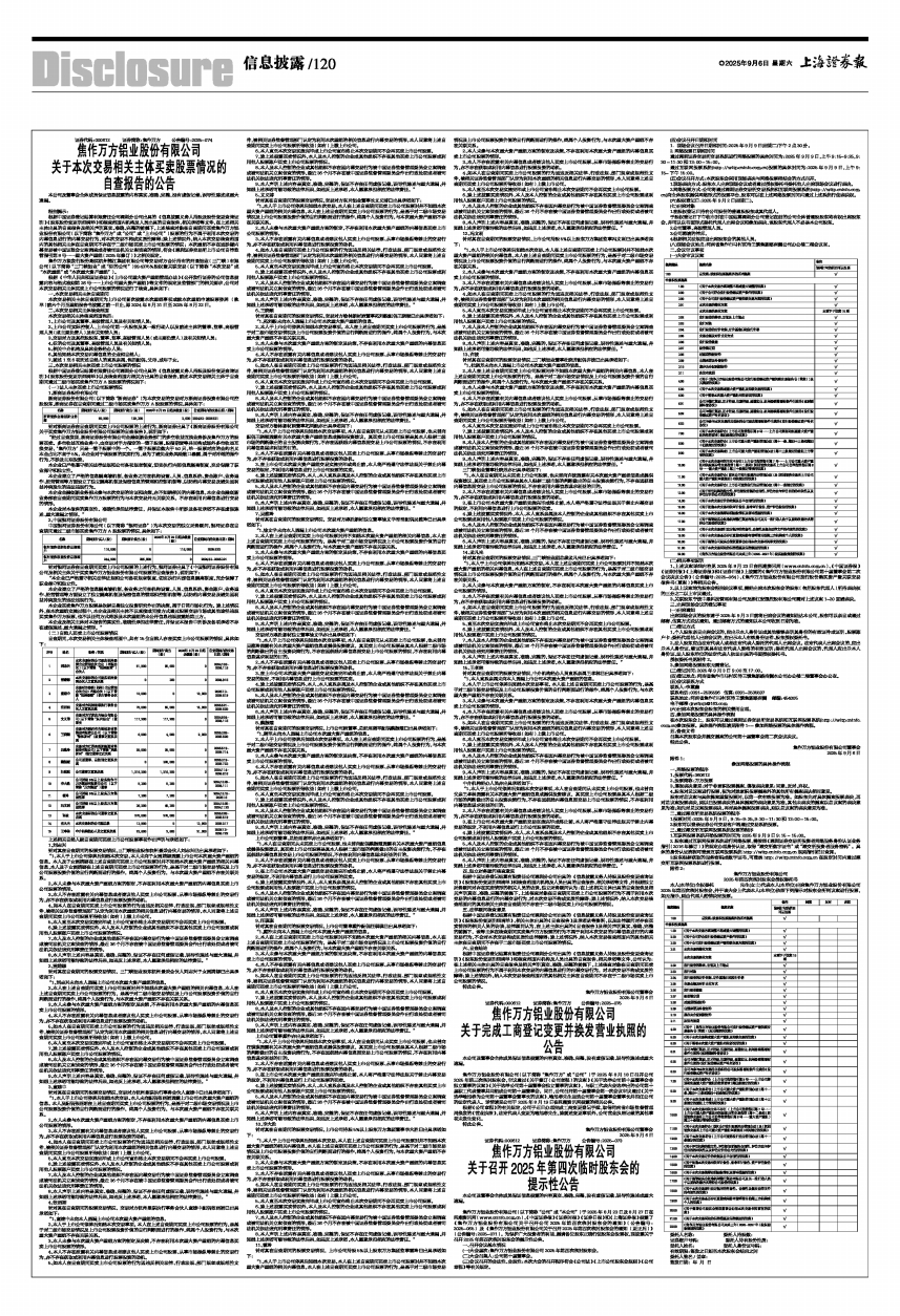 1、上述议案详细内容见2025年8月23日在巨潮资讯网(www.cninfo.com.cn)、《中国证券报》《证券时报》《上海证券报》和《证券日报》上披露的《焦作万方铝业股份有限公司第十届董事会第二次会议决议公告》(公告编号:2025-064)、《焦作万方铝业股份有限公司发行股份购买资产暨关联交易报告书(草案)》等相关公告。