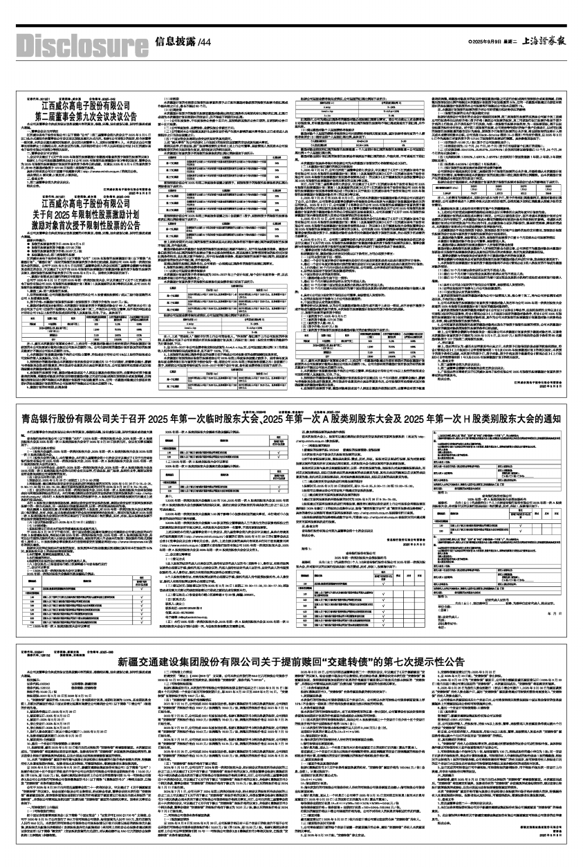 青岛银行股份有限公司(以下简称“本行”)2025年第一次临时股东大会、2025年第一次A股类别股东大会及2025年第一次H股类别股东大会定于2025年9月26日依次召开,会议有关事项通知如下: