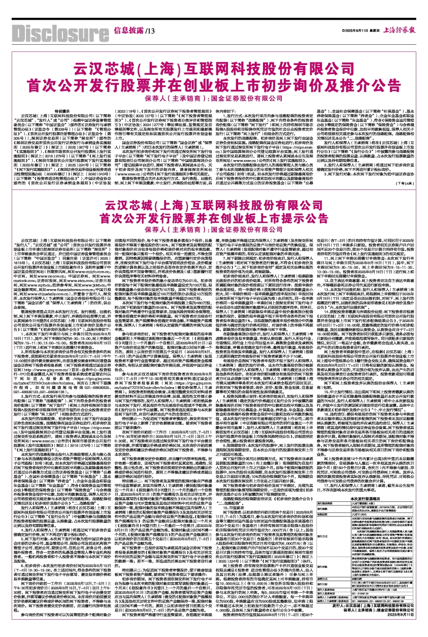 云汉芯城(上海)互联网科技股份有限公司(以下简称“云汉芯城”、“发行人”或“公司”)根据中国证券监督管理委员会(以下简称“中国证监会”)颁布的《证券发行与承销管理办法》(证监会令〔第228号〕)(以下简称“《管理办法》”)、《首次公开发行股票注册管理办法》(证监会令〔第205号〕),深圳证券交易所(以下简称“深交所”)颁布的《深圳证券交易所首次公开发行证券发行与承销业务实施细则(2025年修订)》(深证上〔2025〕267号)(以下简称“《实施细则》”)、《深圳市场首次公开发行股票网上发行实施细则》(深证上〔2018〕279号)(以下简称“《网上发行实施细则》”)、《深圳市场首次公开发行股票网下发行实施细则(2025年修订)》(深证上〔2025〕224号)(以下简称“《网下发行实施细则》”)、《深圳证券交易所创业板投资者适当性管理实施办法(2020年修订)》(深证上〔2020〕343号)(以下简称“《投资者适当性管理办法》”),中国证券业协会颁布的《首次公开发行证券承销业务规则》(中证协发〔2023〕18号)、《首次公开发行证券网下投资者管理规则》(中证协发〔2025〕57号)(以下简称“《网下投资者管理规则》”)、《首次公开发行证券网下投资者分类评价和管理指引》(中证协发〔2024〕277号)等法律法规、监管规定及自律规则等文件,以及深交所有关股票发行上市规则和最新操作指引等有关规定组织实施首次公开发行股票并在创业板上市。