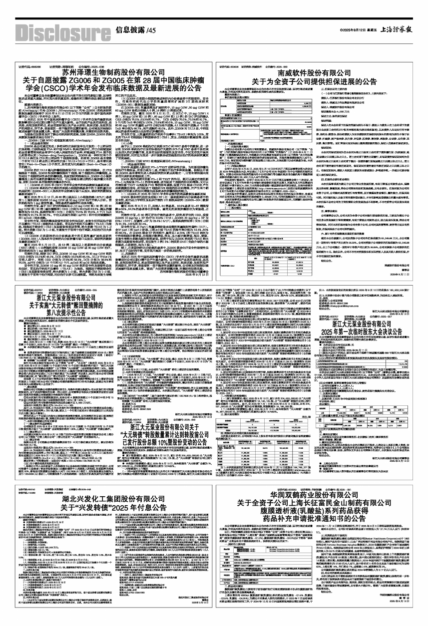 1、苏州泽璟生物制药股份有限公司(以下简称“公司”)自主研发的新药Alveltamig(代号:ZG006)、Nilvanstomig(代号:ZG005)的临床研究数据及最新进展将于2025年9月10日至14日召开的第28届中国临床肿瘤学会(CSCO)学术年会上发布。