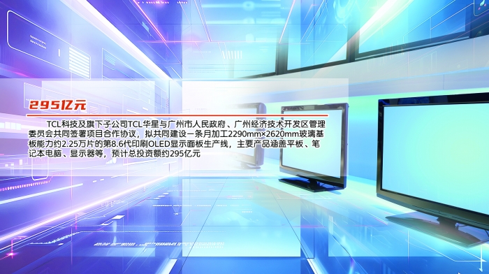 近日,TCL科技公告,公司及旗下子公司TCL华星与广州市人民政府、广州经济技术开发区管理委员会共同签署项目合作协议,拟共同建设一条月加工2290mm×2620mm玻璃基板能力约2.25万片的第8.6代印刷OLED显示面板生产线(简称“t8项目”),主要产品涵盖平板、笔记本电脑、显示器等,预计总投资额约295亿元。