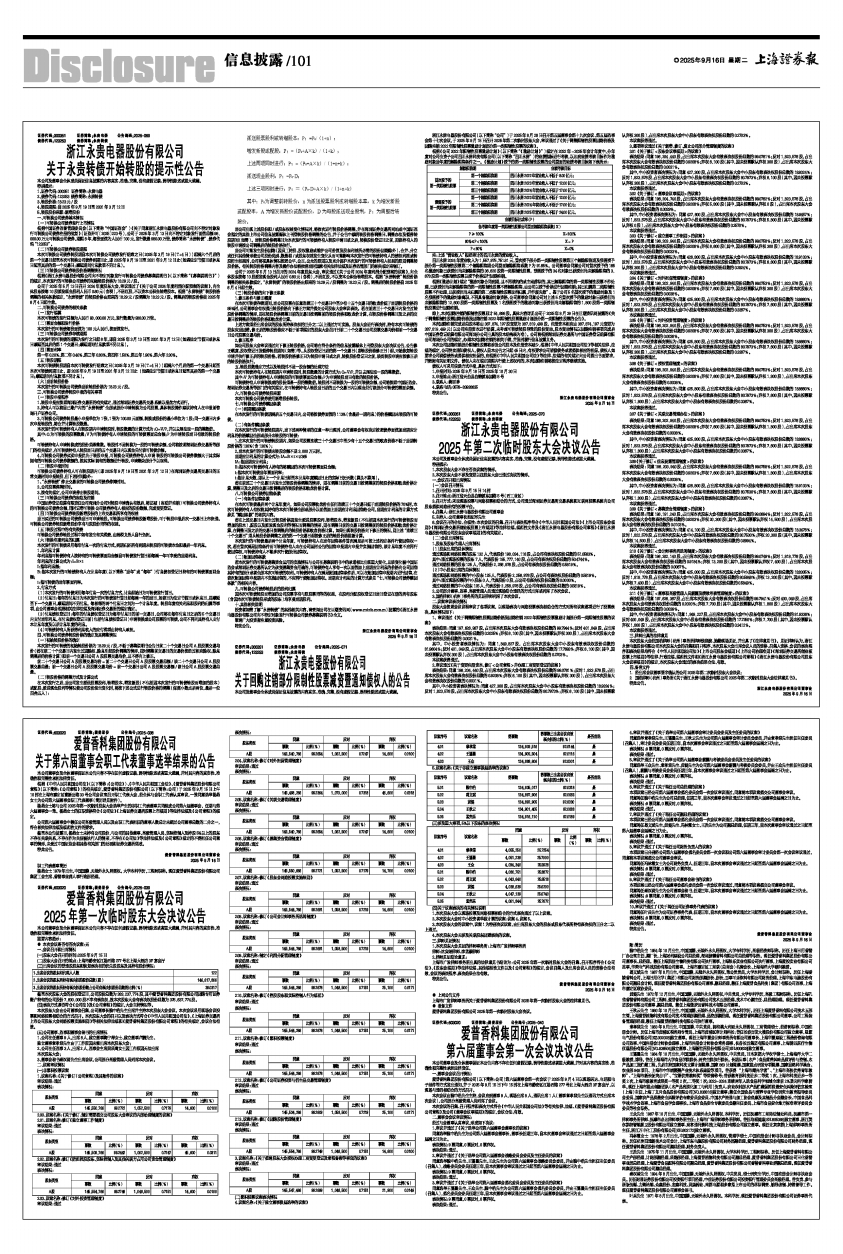 爱普香料集团股份有限公司(以下简称:公司)第六届董事会第一次会议于2025年9月4日以现场送达、电话和电子邮件等方式发出通知,并于2025年9月15日下午15时在上海市静安区江场西路277号北上海大酒店3F宴会厅,以现场与通讯相结合的方式召开。