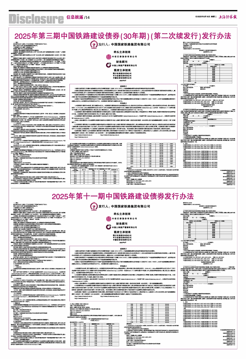 6.投资者欲了解发行人及本期续发行债券发行的基本情况,请详细阅读于2025年9月16日刊登在《中国证券报》《上海证券报》《人民铁道》上的《2025年第三期中国铁路建设债券(30年期)(第二次续发行)及 2025年第十一期中国铁路建设债券募集说明书摘要》,或到以下互联网网址查询: