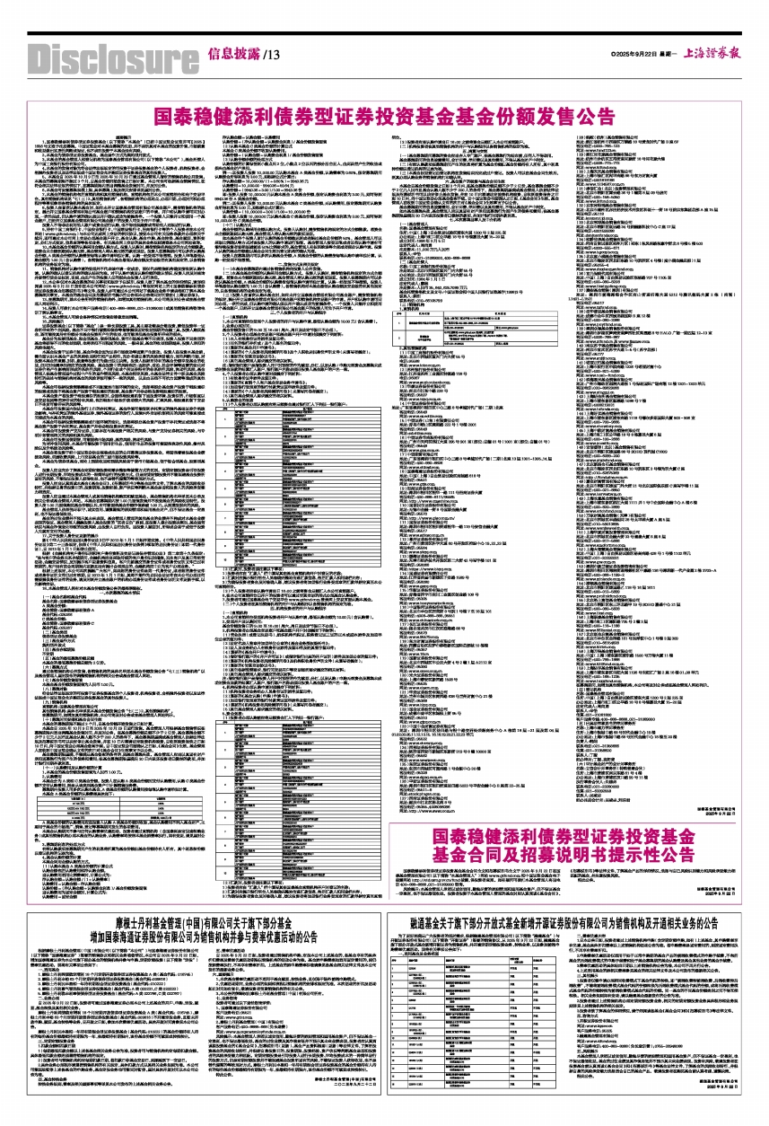 12、本公告仅对本基金募集的有关事项和规定予以说明,投资人欲了解本基金的详细情况,请详细阅读2025年9月22日发布在本公司网站(www.gtfund.com)等规定网站上的《国泰稳健添利债券型证券投资基金招募说明书》等文件,投资人亦可通过本公司网站下载基金业务申请表格和了解本基金募集相关事宜。本基金的基金合同及招募说明书提示性公告和本公告将同时刊登在《上海证券报》。