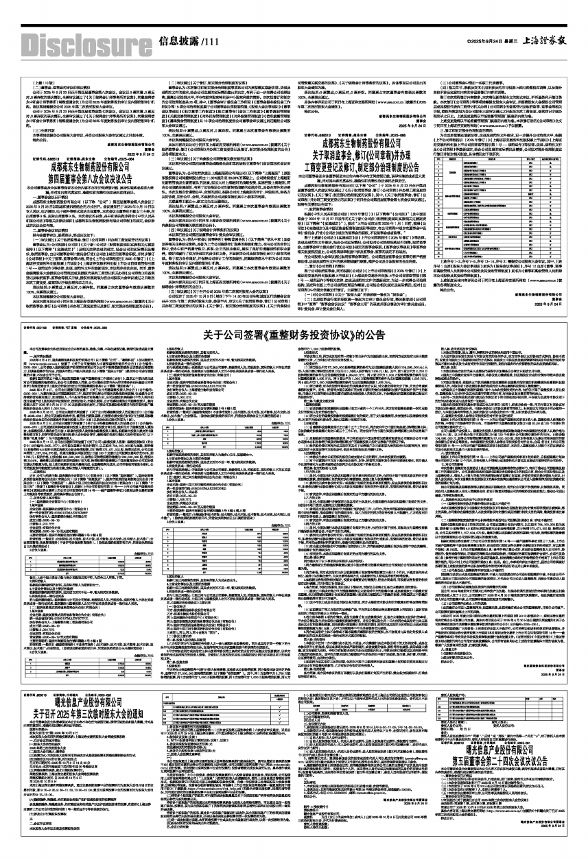 公司拟定于2025年10月9日(周四)下午14:00在公司生物城园区行政楼会议室召开2025年第二次临时股东大会,会期半天,审议《关于取消监事会、修订〈公司章程〉并办理工商变更登记的议案》、《关于修订、制定部分治理制度的议案》、《关于向参股公司增资暨关联交易的议案》、《关于续聘会计师事务所的议案》,具体事宜以公司发出的股东大会通知为准。