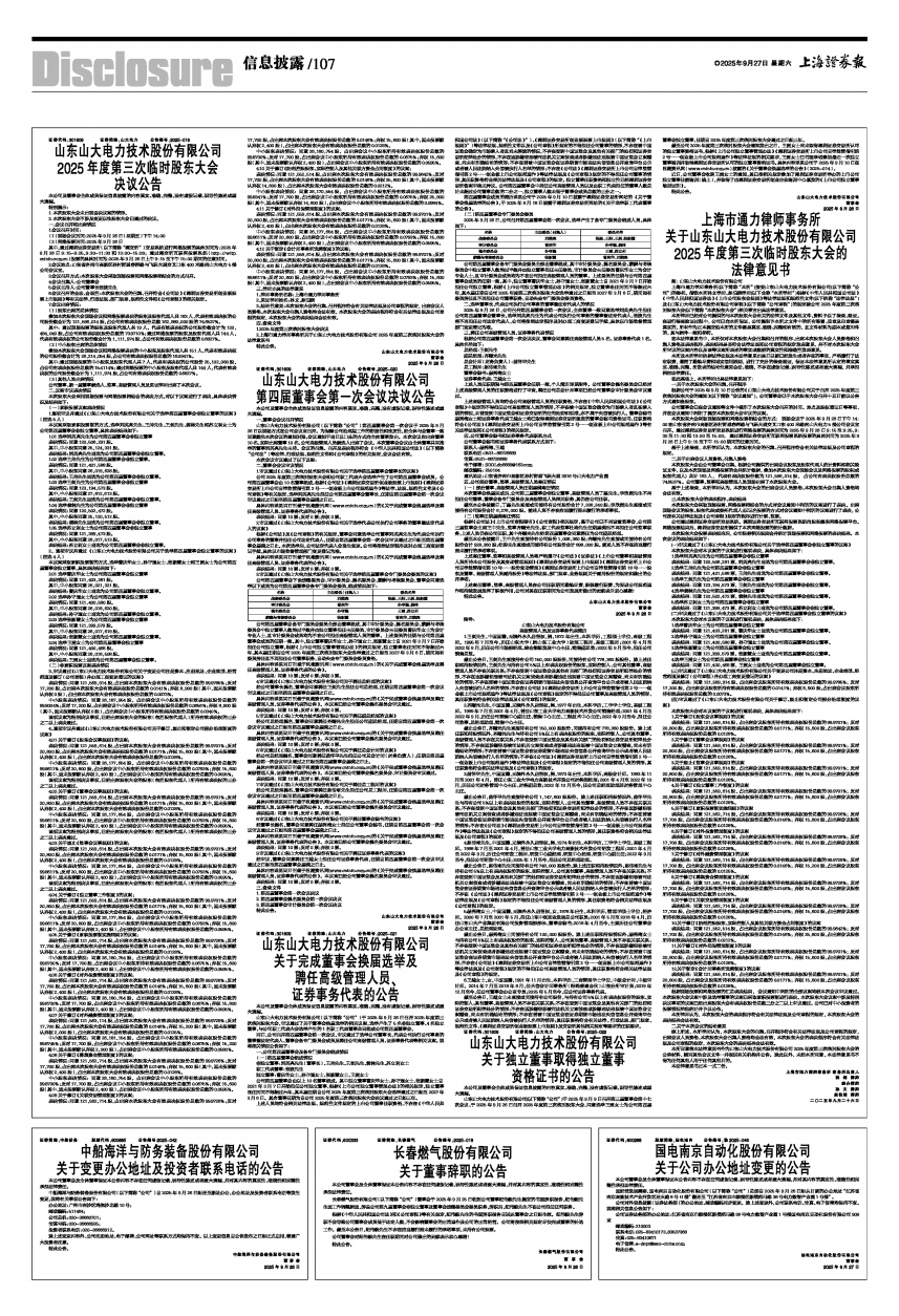 上海市通力律师事务所(以下简称“本所”)接受山东山大电力技术股份有限公司(以下简称“公司”)的委托, 指派本所孙文律师、赵伯晓律师(以下合称“本所律师”)根据《中华人民共和国公司法》《中华人民共和国证券法》《上市公司股东会规则》等法律法规和规范性文件(以下统称“法律法规”)及《山东山大电力技术股份有限公司章程》(以下简称“公司章程”)的规定就公司2025年度第三次临时股东大会(以下简称“本次股东大会”)相关事宜出具法律意见。