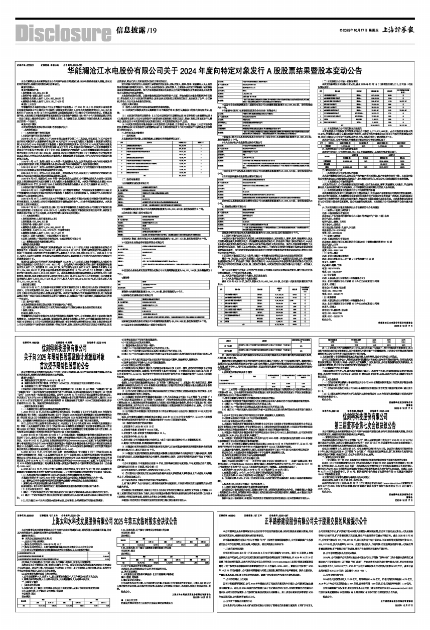 华能澜沧江水电股份有限公司(以下简称公司或发行人)于2025年10月15日收到中国证券登记结算有限责任公司上海分公司出具的《证券变更登记证明》,公司本次发行新增的631,094,257股股份已于2025年10月14日在中国证券登记结算有限责任公司上海分公司办理完成登记、托管及限售手续。本次向特定对象发行新增普通股股份为有限售条件流通股,预计将于6个月限售期届满后的次一交易日起在上海证券交易所(以下简称上交所)上市流通交易,如遇法定节假日或休息日,则顺延至其后的第一个交易日。
