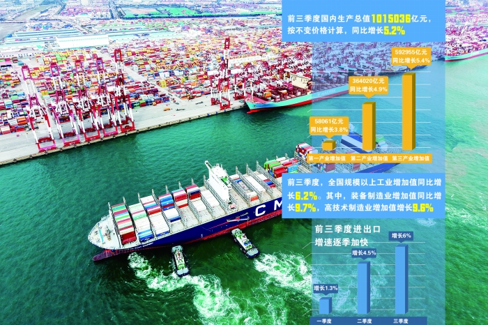 今年以来,我国经济顶住压力、稳步前行。国家统计局10月20日发布的数据显示,前三季度国内生产总值为1015036亿元,按不变价格计算,同比增长5.2%。主要宏观经济指标总体平稳,新质生产力加快培育,高质量发展取得新成效,为实现全年预期目标奠定基础。
