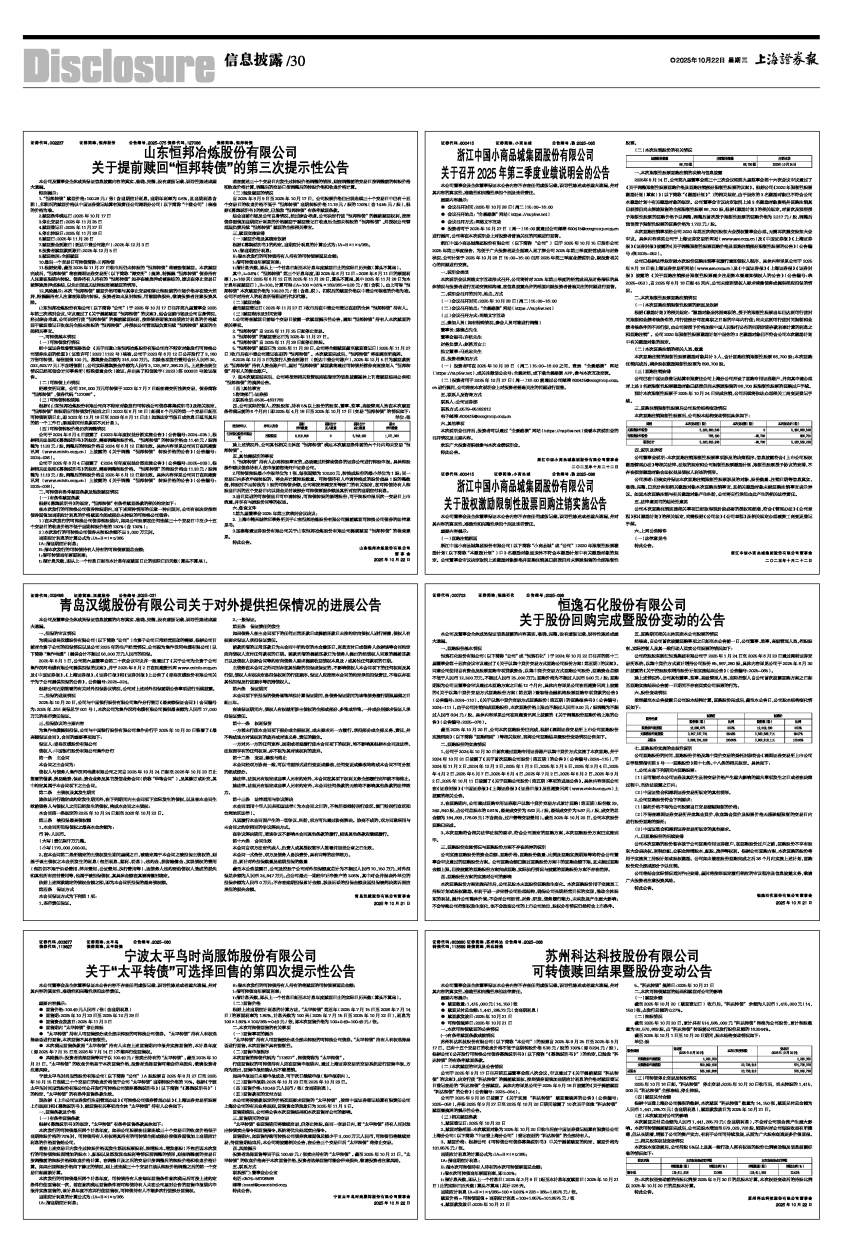 2、在回购期内,公司通过回购专用证券账户以集中竞价交易方式累计回购(第五期)股份数29,240,840股,占公司总股本的0.81%,最高成交价为6.62元/股,最低成交价为5.97元/股,成交的总金额为184,899,176.08元(不含佣金、过户费等交易费用)。截至2025年10月20日,公司本次股份回购已完成。