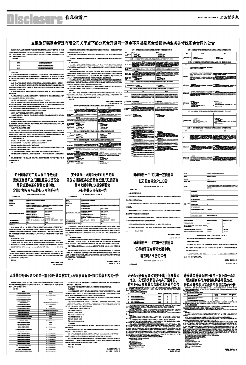 (1)本基金于2025年10月23日暂停大额申购、转换转入,单个账户每一开放日申购、转换转入累计不得超过100万元(不含100万元)。本基金于2025年10月24日恢复大额申购、转换转入,届时将不再另行公告。
