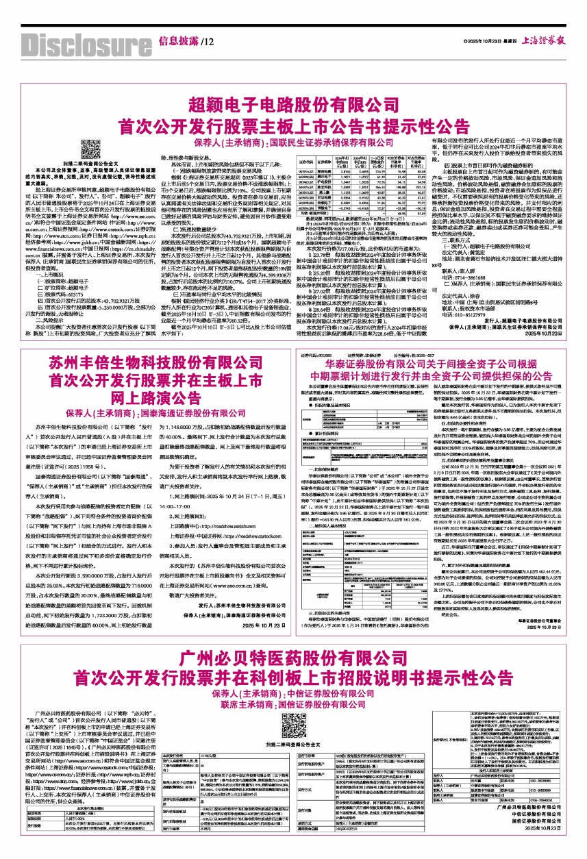 经上海证券交易所审核同意,超颖电子电路股份有限公司(以下简称“本公司”、“发行人”、“公司”、“超颖电子”)发行的人民币普通股股票将于2025年10月24日在上海证券交易所主板上市,上市公告书全文和首次公开发行股票的招股说明书全文披露于上海证券交易所网站(http://www.sse.com.cn/)和符合中国证监会规定条件网站(中证网:http://www.cs.com.cn;上海证券报网:http://www.cnstock.com;证券时报网:http://www.stcn.com;证券日报网:http://www.zqrb.cn;经济参考网:http://www.jjckb.cn;中国金融新闻网:https://www.financialnews.com.cn;中国日报网:https://cn.chinadaily.com.cn)披露,并置备于发行人、上海证券交易所、本次发行保荐人(主承销商)国联民生证券承销保荐有限公司的住所,供投资者查阅。