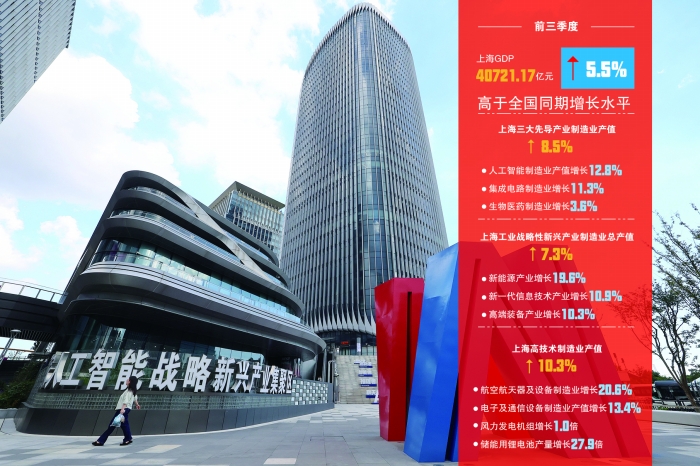 今年前三季度,上海市工业增加值同比增长5.2%,规模以上工业总产值增长5.7%,以人工智能、集成电路、生物医药为代表的三大先导产业制造业产值同比增长8.5%,成为拉动工业增长的重要引擎。