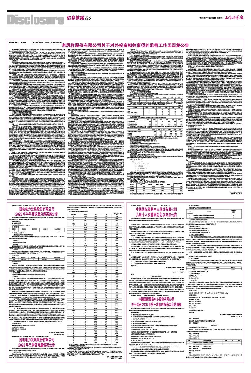 老凤祥股份有限公司(以下简称“本公司”“公司”“老凤祥”)于2025年10月14日收到上海证券交易所上市公司管理一部《关于老凤祥股份有限公司对外投资相关事项的监管工作函》(上证公函【2025】1439号)(以下简称“《监管工作函》”)。《监管工作函》对公司控股子公司投资迈巴赫奢侈品亚太有限公司股权及品牌代理相关事项(以下简称“对外投资相关事项”)进行了问询。有关对外投资相关事项请详见公司于2025年10月10日发布的公告,公告编号:2025-044、2025-045。现根据相关规定,对《监管工作函》中相关问题作如下风险提示和回复: