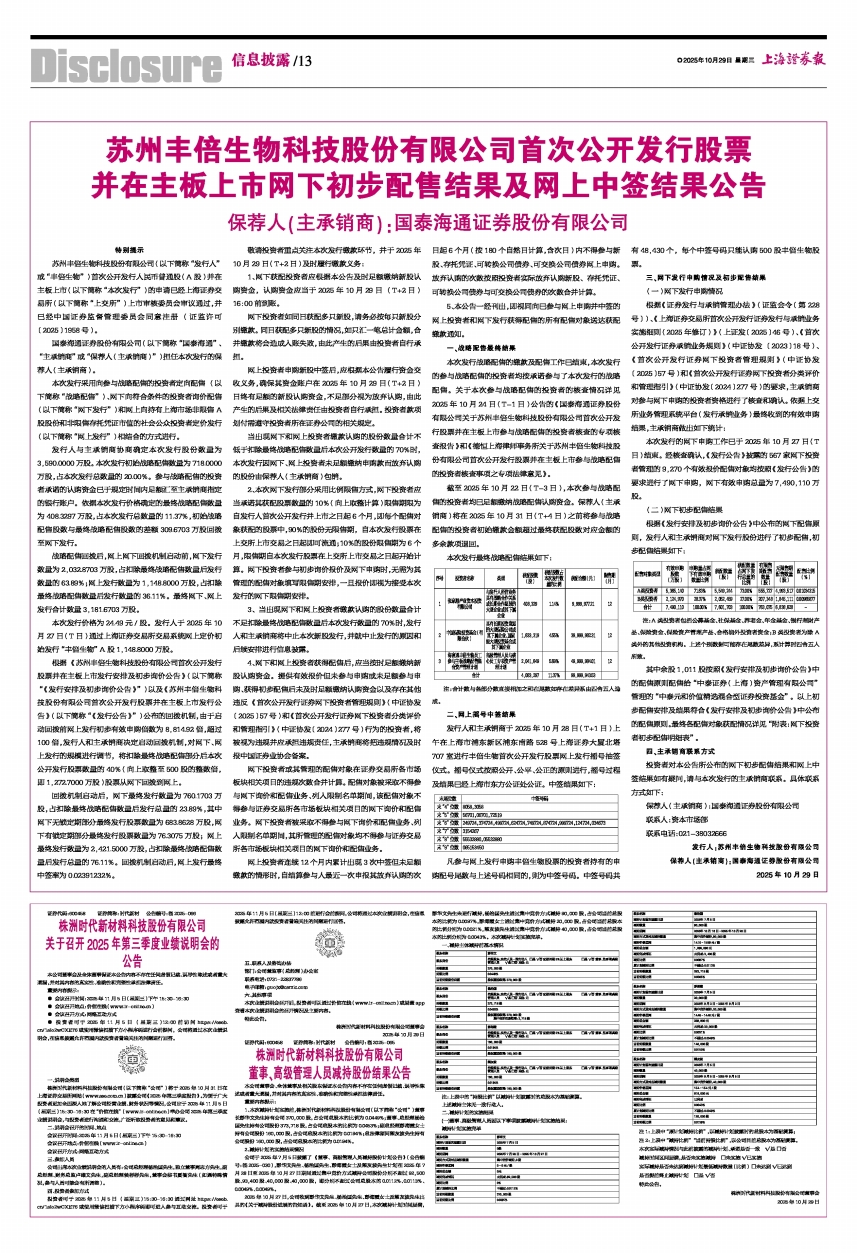 发行人和主承销商于2025年10月28日(T+1日)上午在上海市浦东新区浦东南路528号上海证券大厦北塔707室进行丰倍生物首次公开发行股票网上发行摇号抽签仪式。摇号仪式按照公开、公平、公正的原则进行,摇号过程及结果已经上海市东方公证处公证。中签结果如下: