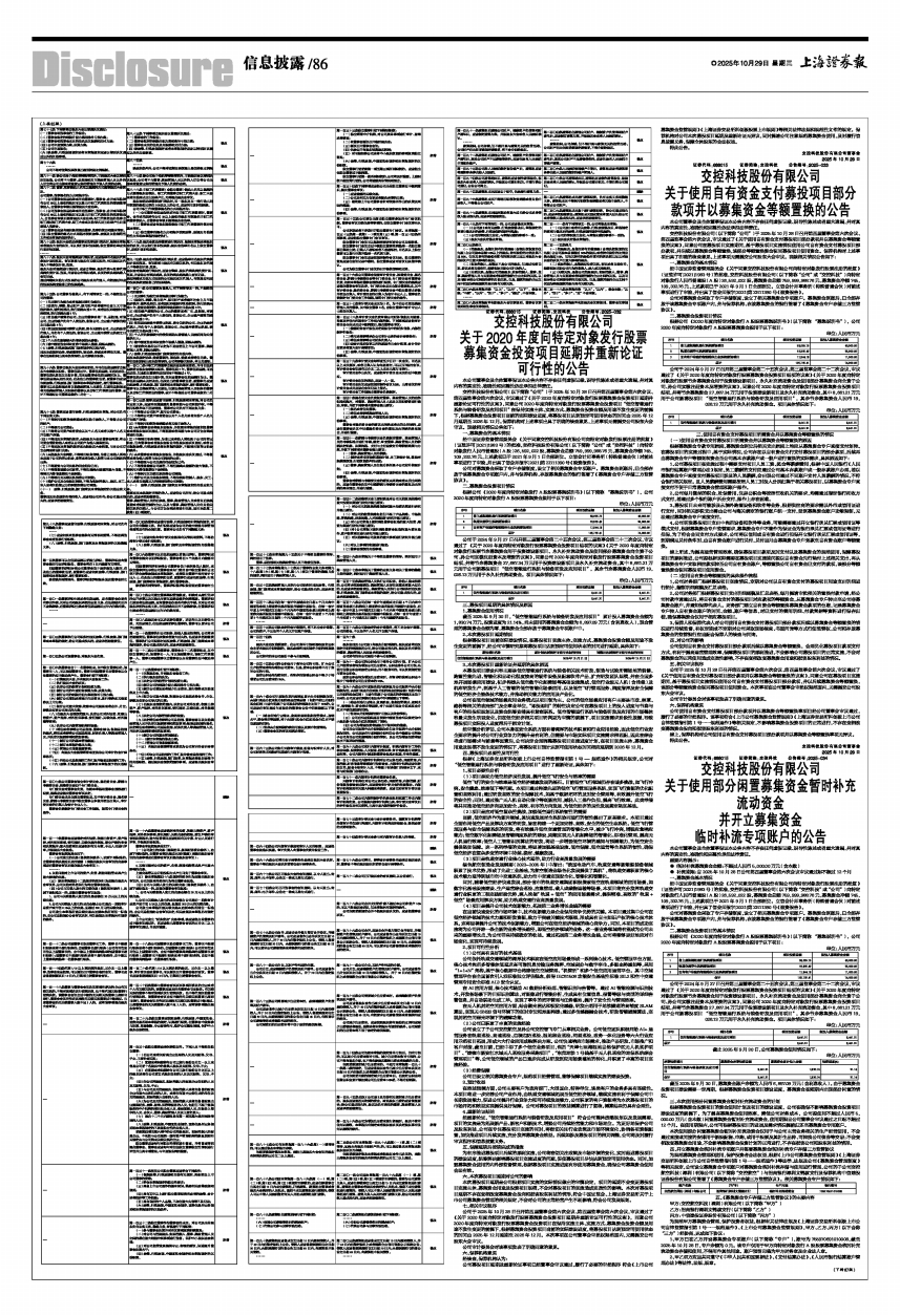 交控科技股份有限公司(以下简称“公司”)于2025年10月28日召开第四届董事会第六次会议、第四届监事会第六次会议,审议通过了《关于使用自有资金支付募投项目部分款项并以募集资金等额置换的议案》,同意公司在募投项目实施期间,基于募投项目实施情况使用公司自有资金支付募投项目部分款项,并后续以募集资金等额置换,该部分等额置换资金视同募投项目使用资金。保荐机构对上述事项出具了明确的核查意见,上述事项无需提交公司股东大会审议。现就相关情况公告如下: