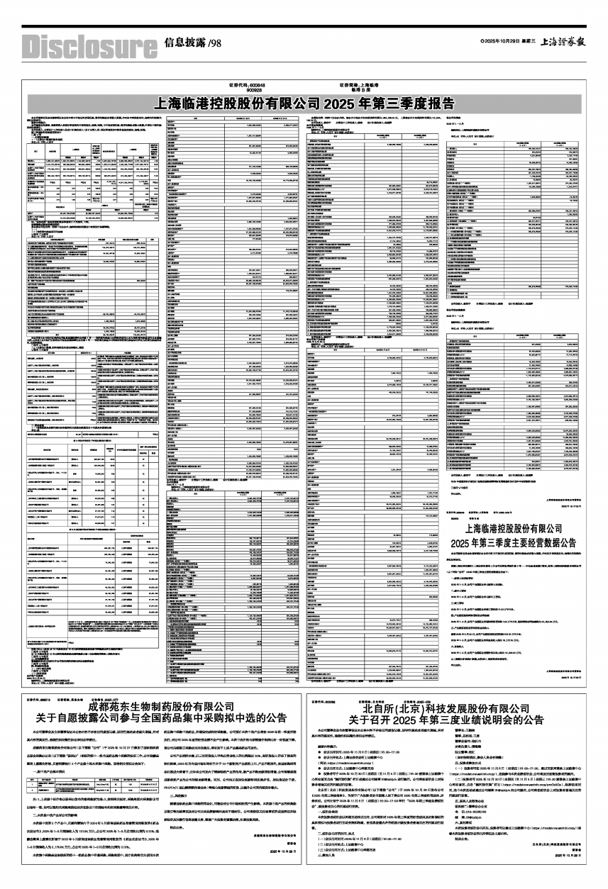 根据上海证券交易所《上海证券交易所上市公司自律监管指引第3号一一行业信息披露》要求,现将上海临港控股股份有限公司(以下简称“公司”)2025年第三季度主要经营数据公告如下: