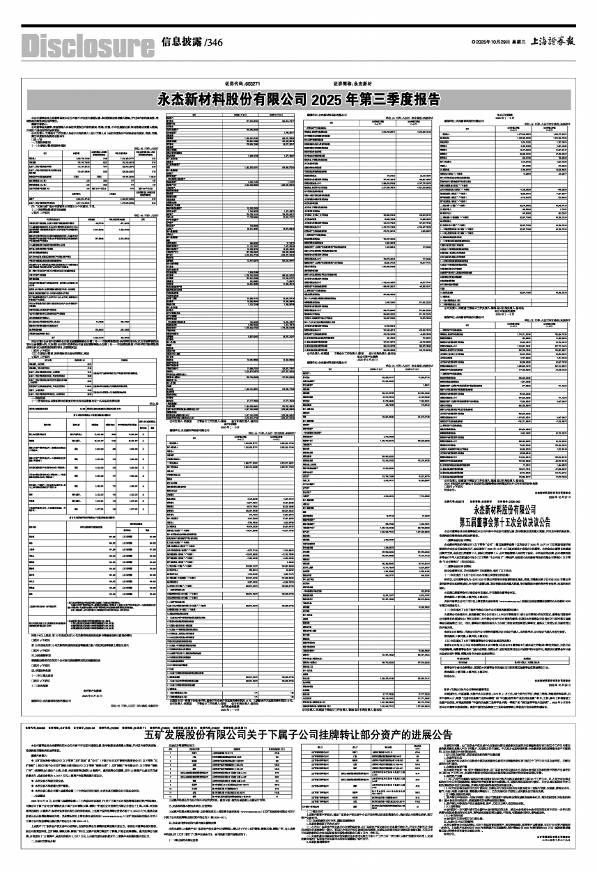具体内容详见公司于同日在上海证券交易所网站(www.sse.com.cn)及指定信息披露媒体披露的《永杰新材2025年第三季度报告》。