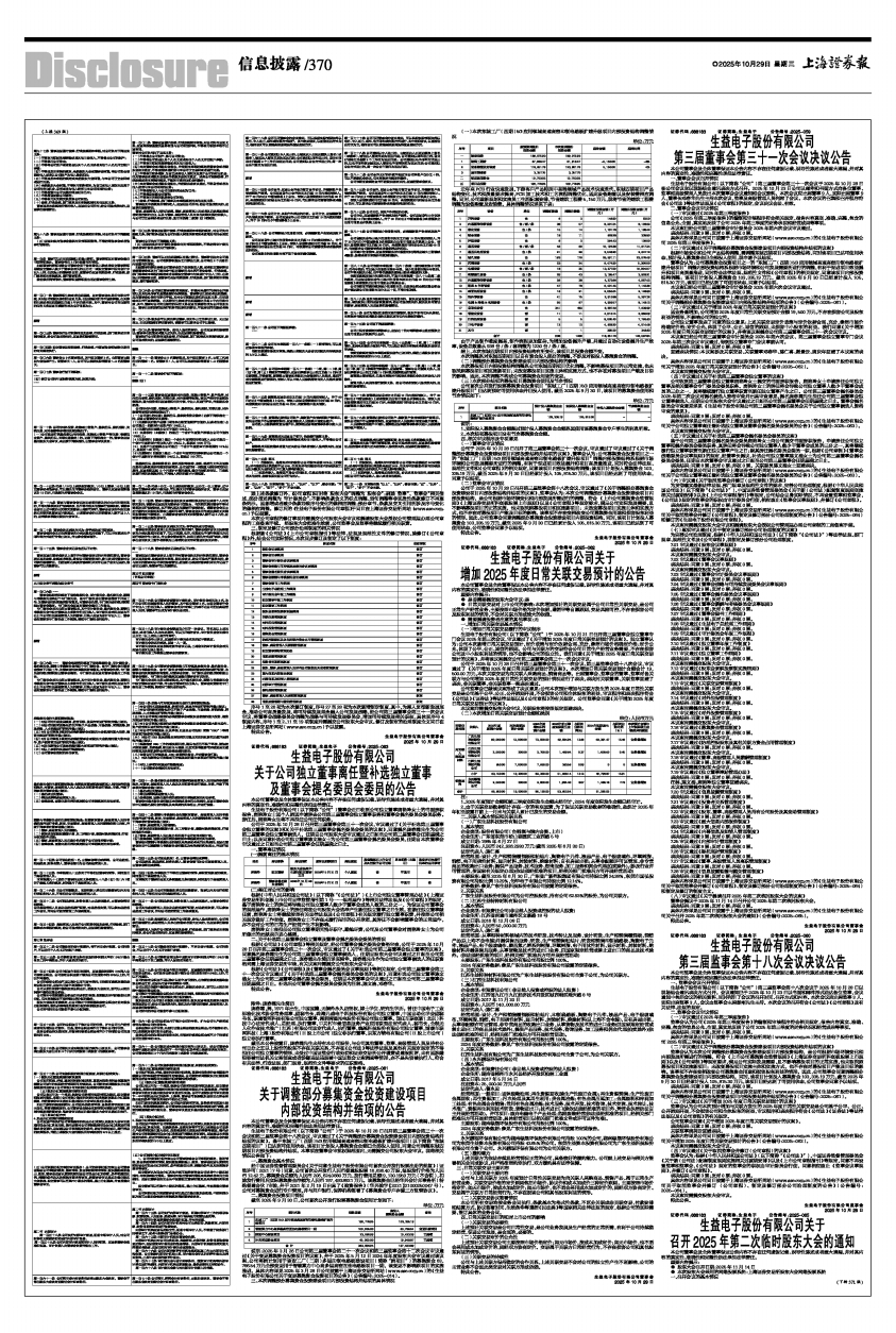 生益电子股份有限公司(以下简称“公司”)第三届监事会第十八次会议于2025年10月28日以现场结合通讯表决方式召开。会议通知已于2025年10月23日以书面和邮件形式送达各位监事,会议通知中包括会议的相关资料,同时列明了会议的召开时间、召开方式和内容。本次会议应出席监事3人,实际出席监事3人,会议由监事会主席彭刚先生主持。本次会议的召开符合《公司法》《公司章程》及有关法律、法规的规定。
