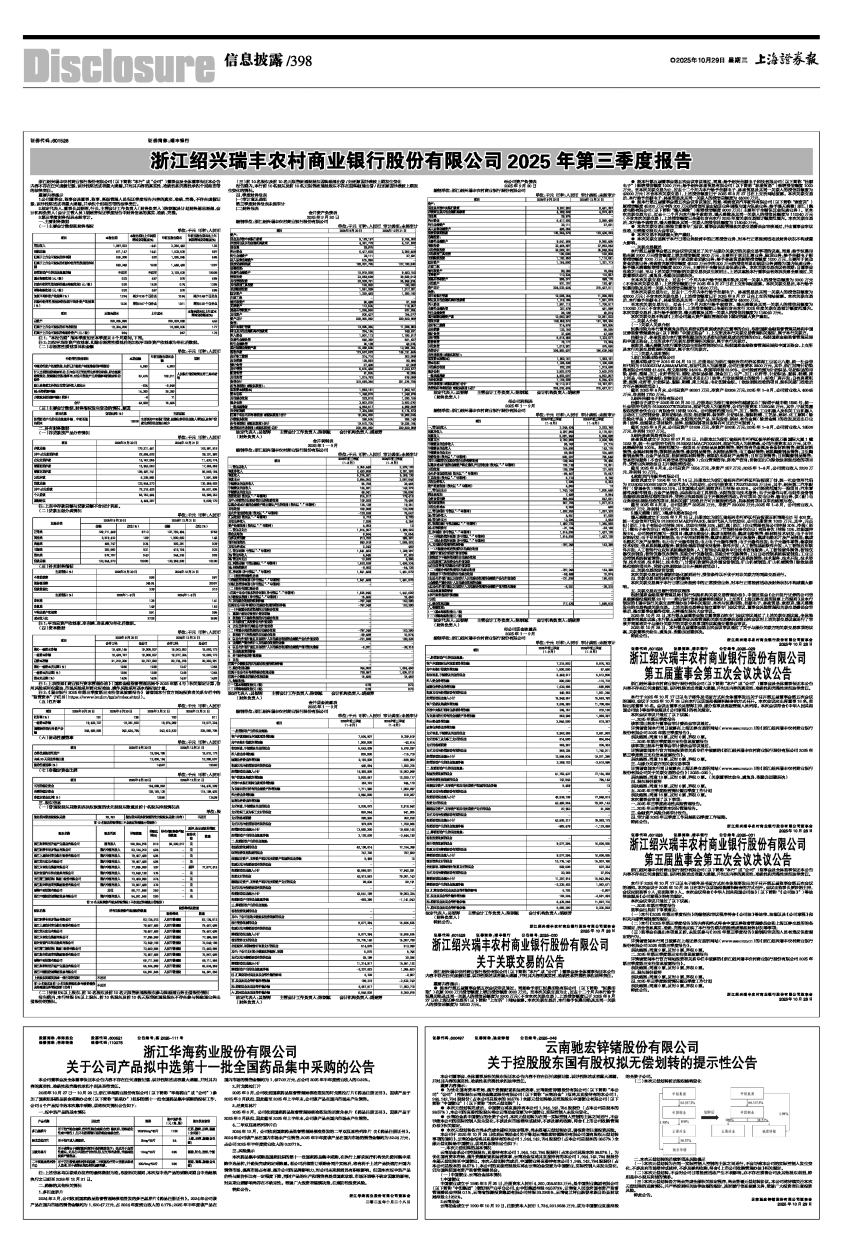 详情请查阅本行同日披露在上海证券交易所网站(www.sse.com.cn)的《浙江绍兴瑞丰农村商业银行股份有限公司2025年第三季度报告》。