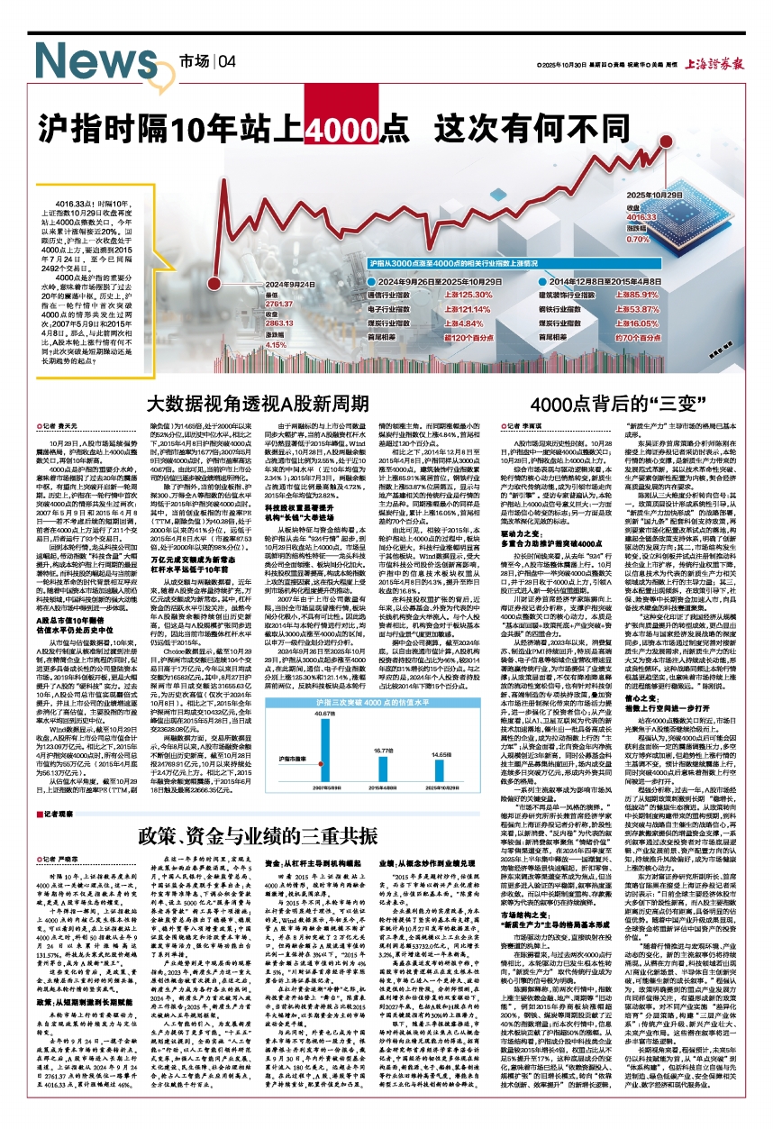 4016.33点!时隔10年,上证指数10月29日收盘再度站上4000点整数关口,今年以来累计涨幅接近20%。回顾历史,沪指上一次收盘处于4000点上方,要追溯到2015年7月24日,至今已间隔2492个交易日。
