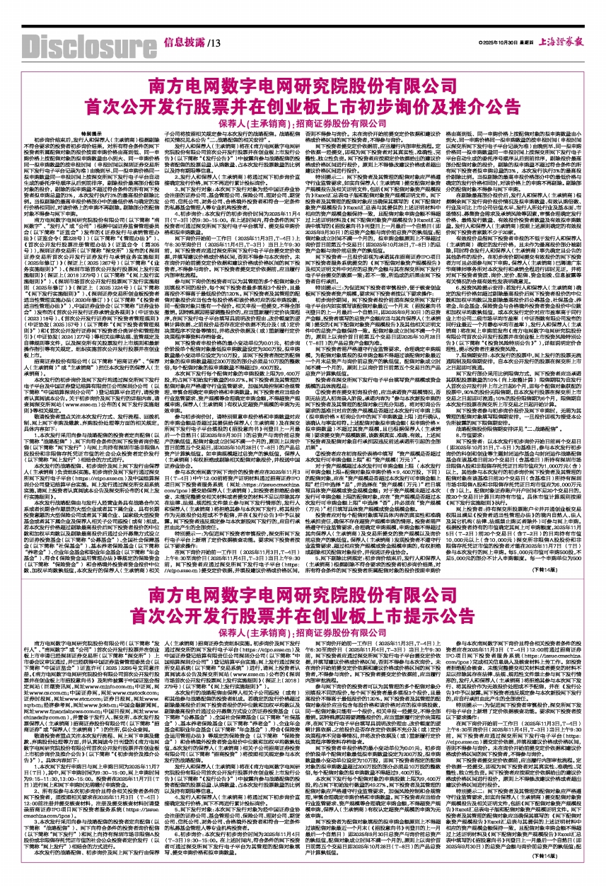 敬请投资者重点关注本次发行流程、网上网下申购及缴款、弃购股份处理等方面,并认真阅读今日刊登的《南方电网数字电网研究院股份有限公司首次公开发行股票并在创业板上市初步询价及推介公告》(以下简称“《初步询价及推介公告》”)。具体内容如下: