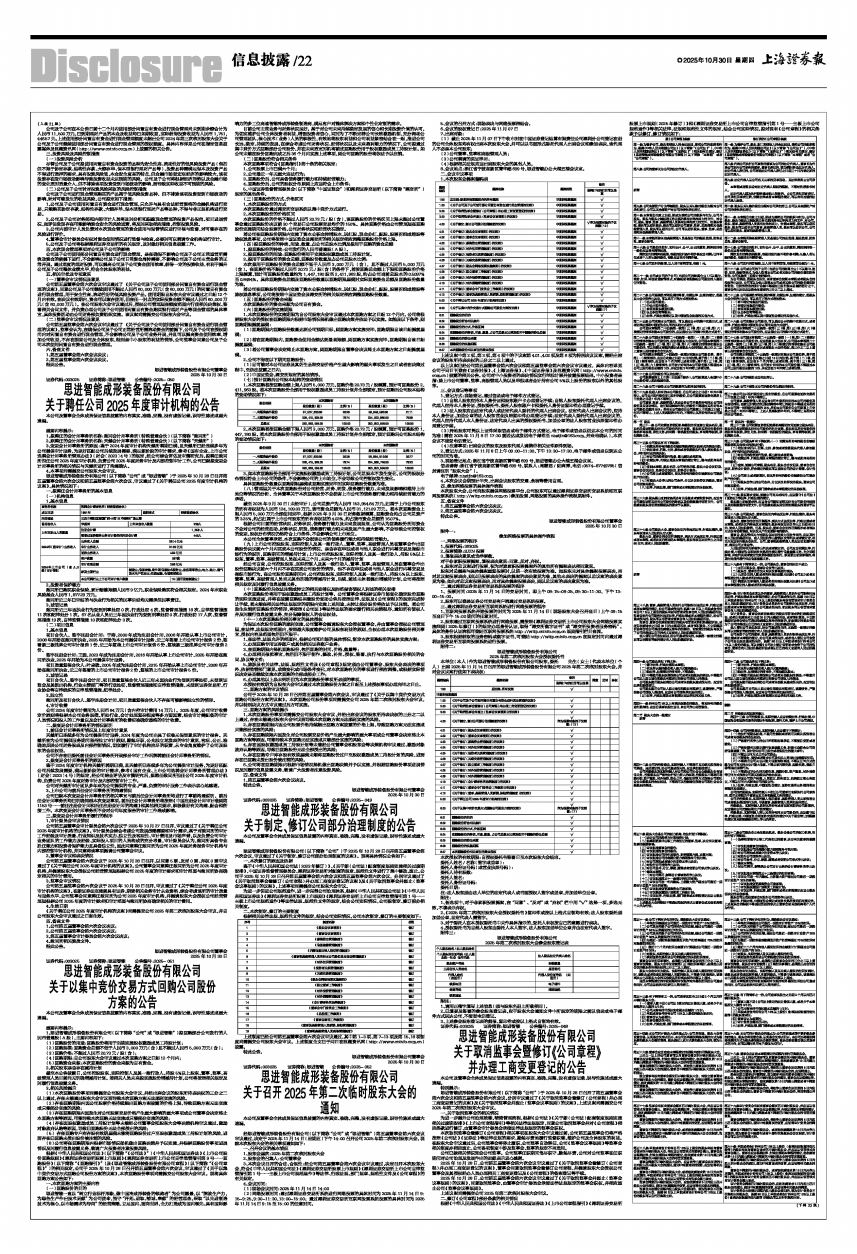 思进智能成形装备股份有限公司(以下简称“公司”)于2025年10月28日召开第五届董事会第六次会议,审议通过了《关于制定、修订公司部分治理制度的议案》。现将具体情况公告如下: