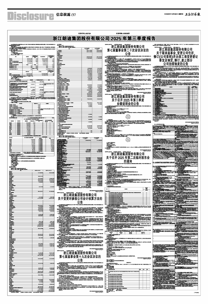 浙江朗迪集团股份有限公司(以下简称“公司”)第七届董事会第二十次会议于2025年10月28日以现场结合通讯表决方式在公司10号楼二楼A211会议室召开。本次会议的通知于2025年10月22日以书面、电话等方式通知全体董事。会议应参加表决董事9名,实际参加表决董事9名。本次会议由董事长高炎康先生主持。公司监事及高级管理人员列席本次会议。本次会议的召开符合《公司法》《公司章程》及其他有关法律法规的规定。